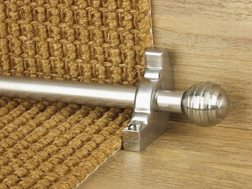 Supplied with a pair of matching-finished stair rod brackets with screws, suitable for installation with carpets or natural flooring fitted with underlay. The standard 12mm (1/2”) brackets supplied have a 14mm clearance to allow for the underlay and carpet.